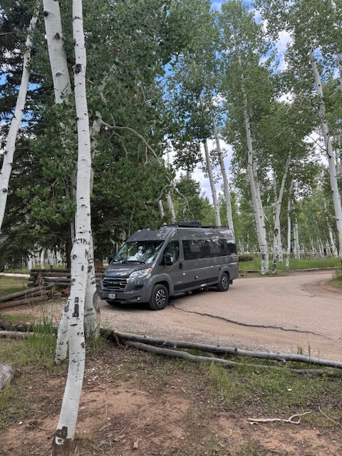 The Viv is a Winnebago Travato 2024 K model. She is 21 ft long, weighs in at a whopping 9000 lbs and is our rolling travel/home. She has a kitchen with frig, two gas burners and a convection microwave. Two single beds, and a full bathroom (small).